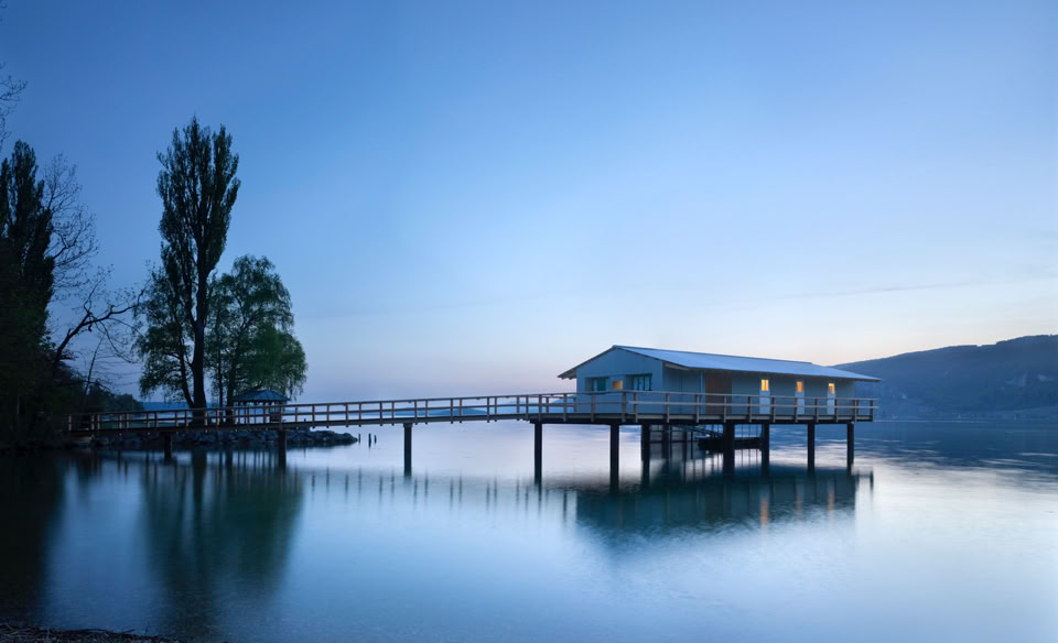 ein steg geht vom park des von rütte gut aus übers wasser zum neuen seehaus,