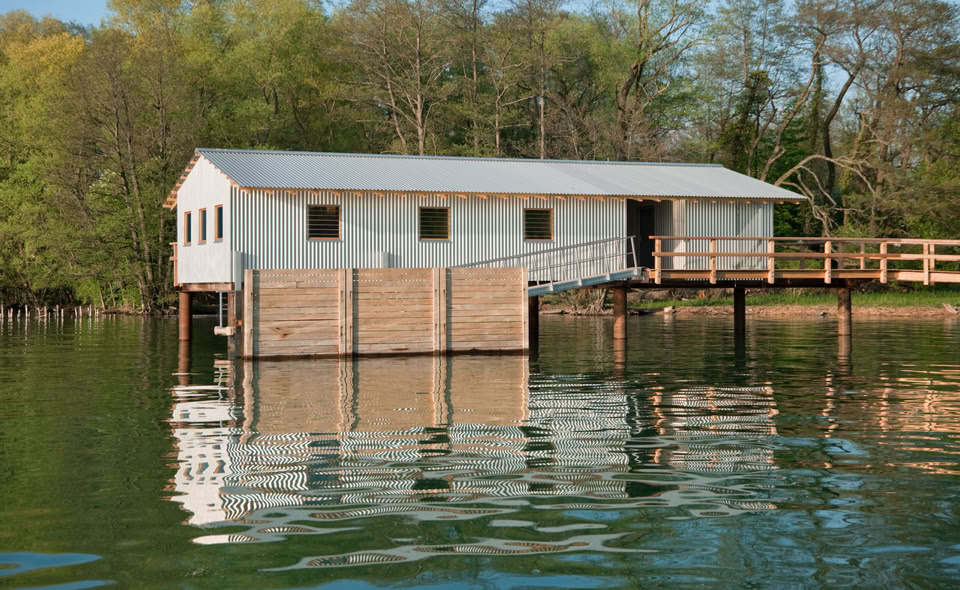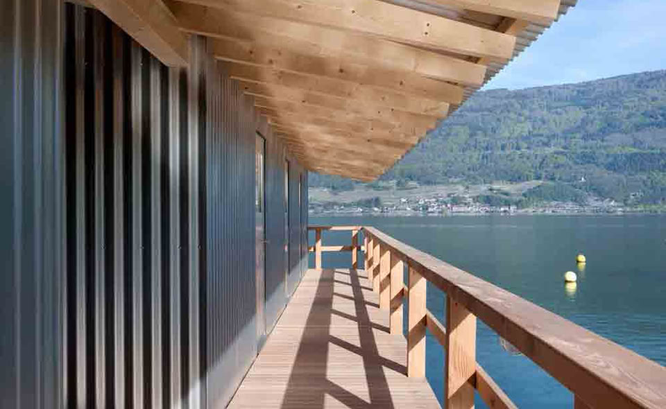 ein steg geht vom park des von rütte gut aus übers wasser zum neuen seehaus,